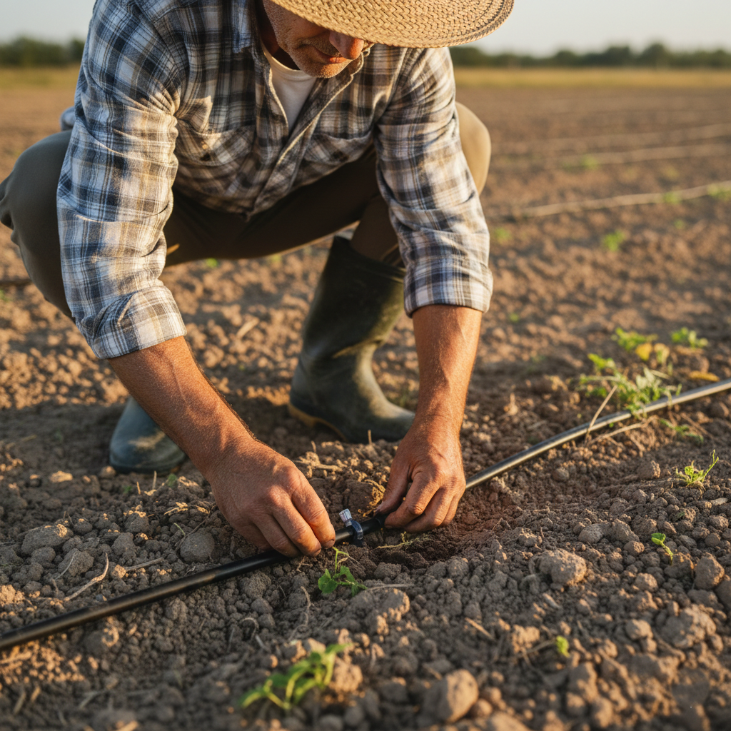- A farmer inspecting drip irrigation pipes in dry soil.